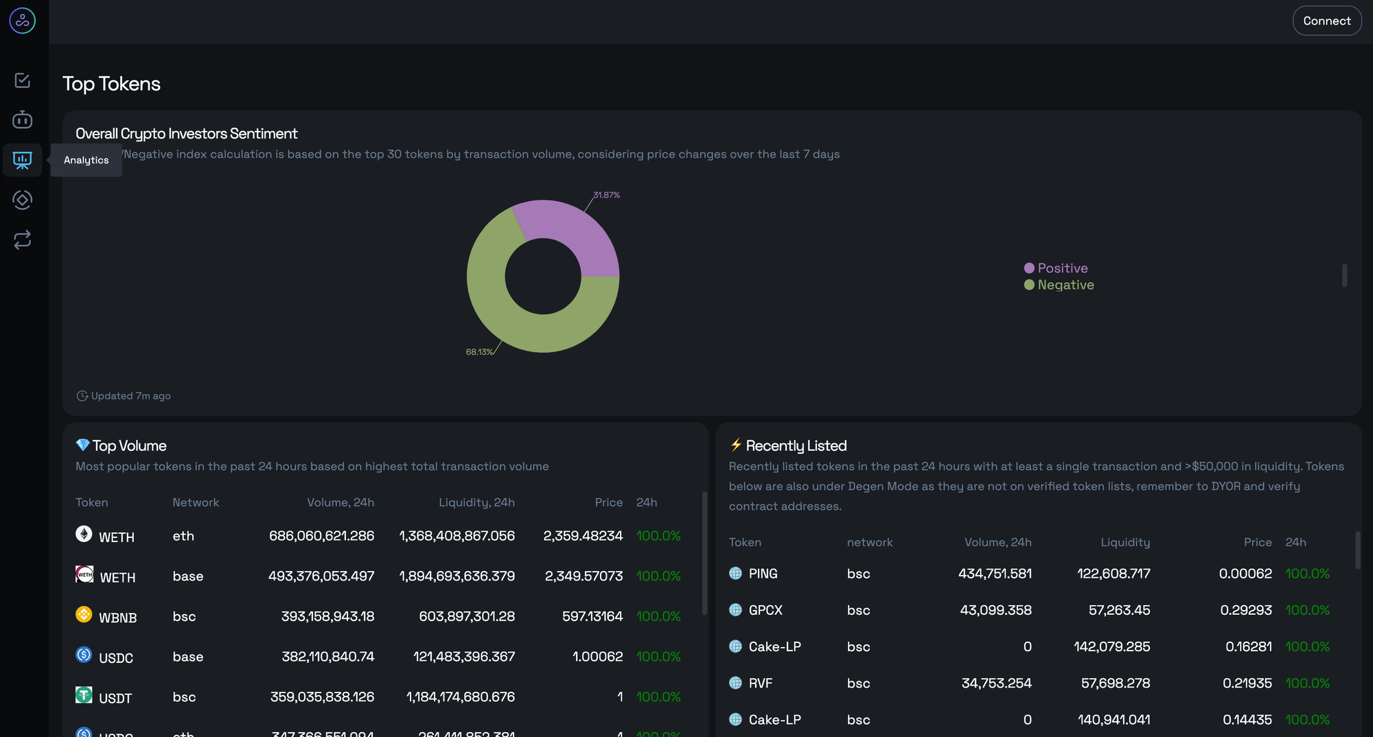 - New analytics dashboards summarize market trends, including top tokens by volume, gainers/losers, and trending assets.