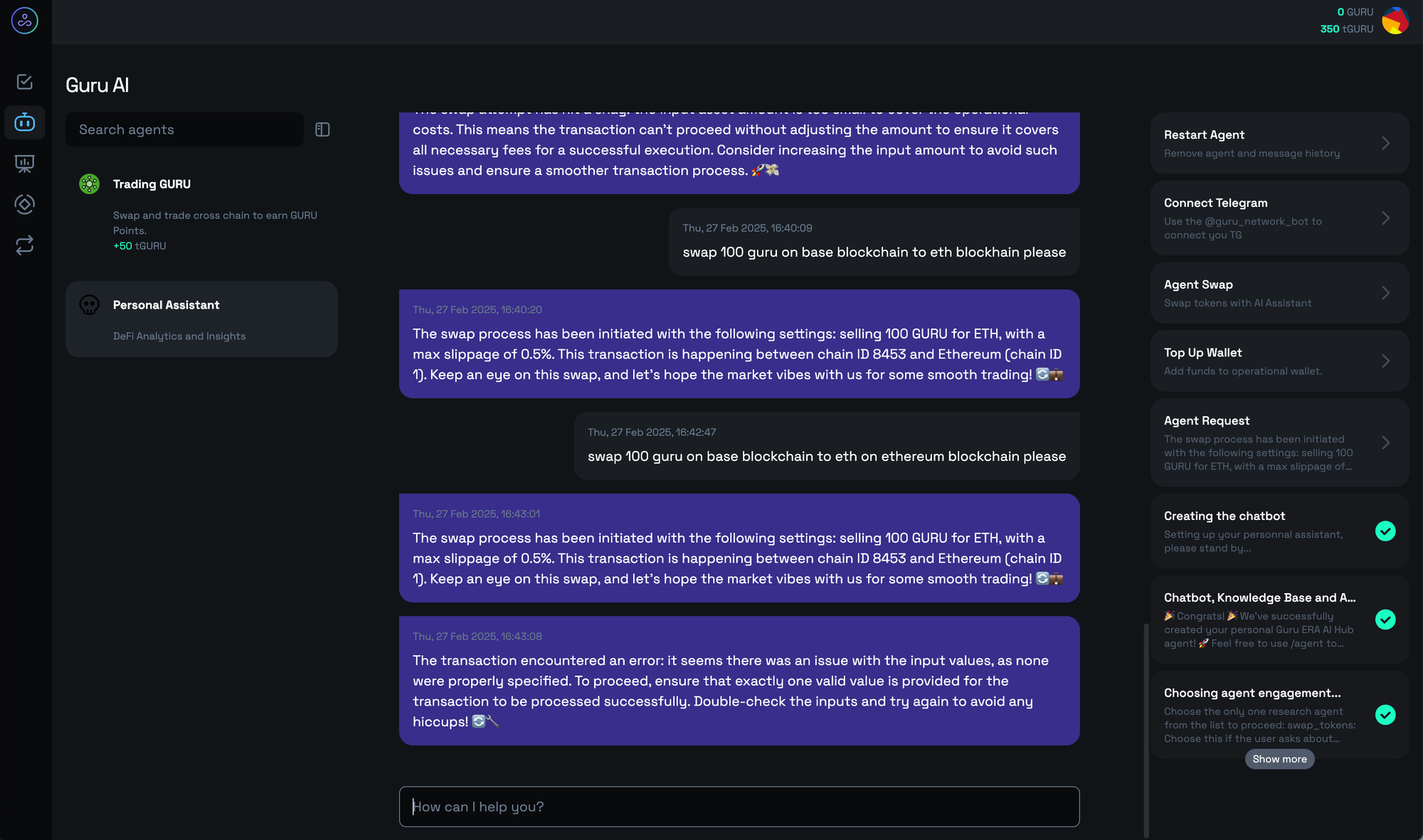 The AMA showcased Guru Network's commitment to innovation through its AI-powered trading terminal, enhanced analytics capabilities, and robust reward system. The platform's roadmap emphasizes user-centric improvements, ecosystem expansion, and sustainable token utility. Community feedback remains integral to shaping future developments.