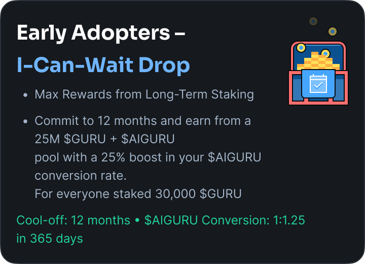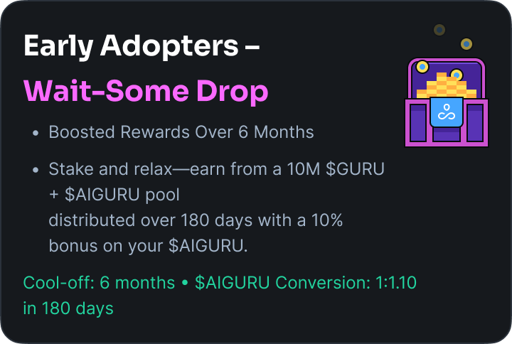 The genius of this system lies in its compounding benefits. Stakers earn daily AIGURU rewards that automatically compound into their stake - everyone likes watching their rewards grow while you sleep. But wait, there's more! When the staking period ends, you get EVERYTHING back plus the opportunity to convert those AIGURU rewards into new project tokens.