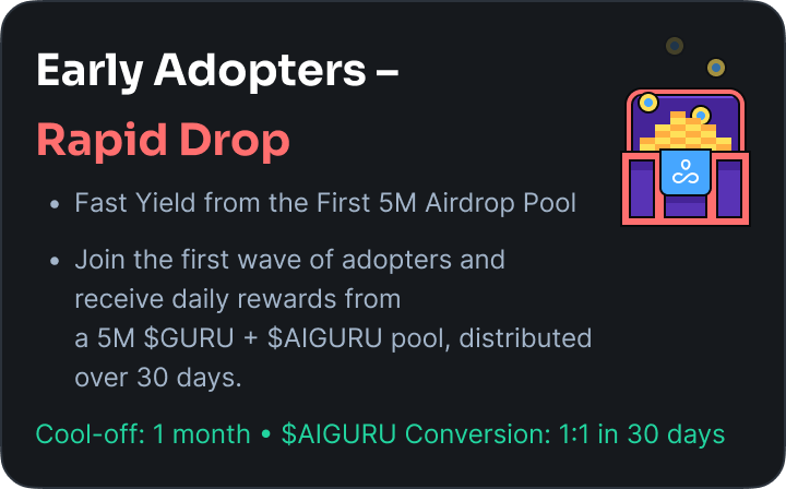 Guru Network's Application Wizard isn't just another launch platform-it's blockchain magic that rewards everyone. Stake GURU tokens, earn compounding rewards, and get first dibs on new projects. Early birds don't just get the worm; they get the whole garden!
